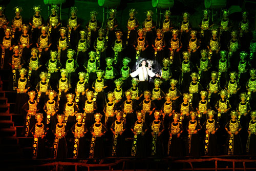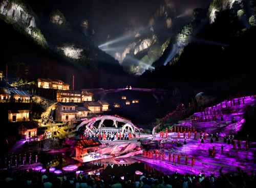 世界第一臺(tái)大型山水實(shí)景音樂(lè)劇《新劉?抽浴吩趶埣医缣扉T(mén)山試演。9月13日晚,參加2009湖南國(guó)際旅游節(jié)的國(guó)內(nèi)外嘉賓、領(lǐng)導(dǎo)和媒體記者近3000人共同見(jiàn)證這一輝煌時(shí)刻。