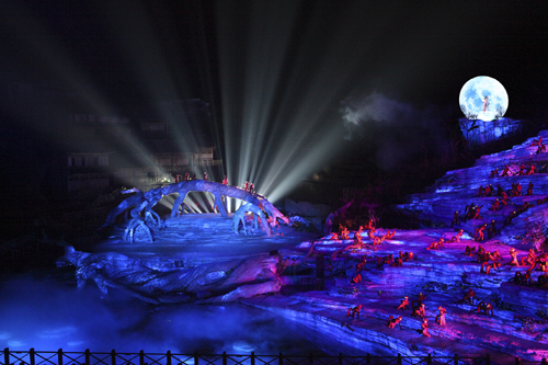 本項(xiàng)目舞臺(tái)及舞美設(shè)施為目前世界范圍內(nèi)的實(shí)景演出中投資最多、舞臺(tái)機(jī)械裝置最為復(fù)雜且規(guī)模最大、燈光設(shè)施數(shù)量最多且分布范圍最大的,另外主舞臺(tái)也是世界最大的全景玻璃鋼舞臺(tái)(10000平方米)。舞臺(tái)機(jī)械設(shè)施中,尤其是跨度60米、高度32米的伸縮飛橋,是目前世界范圍的演出項(xiàng)目中絕無(wú)僅有的大型舞臺(tái)機(jī)械裝置。燈光數(shù)量:大型燈光1100盞,中小型燈光2800盞;演出音響為專門(mén)定制的美國(guó)EAW音戶外防雨、防潮音響設(shè)備,也是目前國(guó)內(nèi)演出項(xiàng)目中投資最大的。