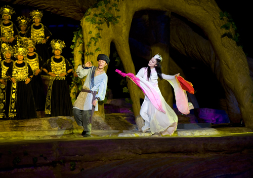 《新劉?抽浴肥鞘澜缟系谝慌_(tái)以高山奇峰為舞臺(tái)背景,以山澗峽谷為表演舞臺(tái)的山水實(shí)景演出;也是目前世界第一臺(tái)有完整故事情節(jié)的山水實(shí)景音樂(lè)歌舞劇。大型山水實(shí)景音樂(lè)劇取材于中國(guó)經(jīng)典的神話傳說(shuō)和民間故事,汲取世界豐富的音樂(lè)文化元素和表現(xiàn)形式,輔之以現(xiàn)代高科技的舞臺(tái)特效技術(shù),是對(duì)世界音樂(lè)歌舞劇的一次成功的創(chuàng)新,成為中國(guó)山水實(shí)景演出的劃時(shí)代巨獻(xiàn)。