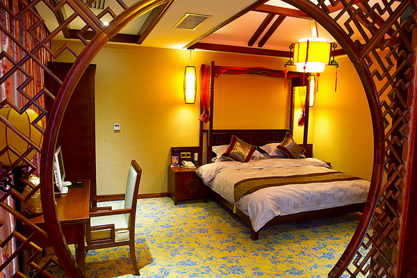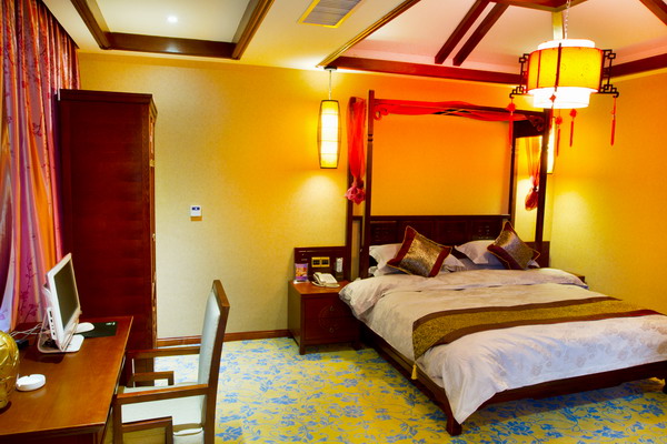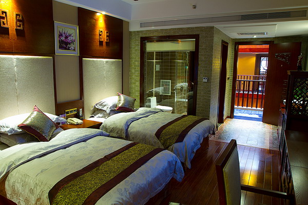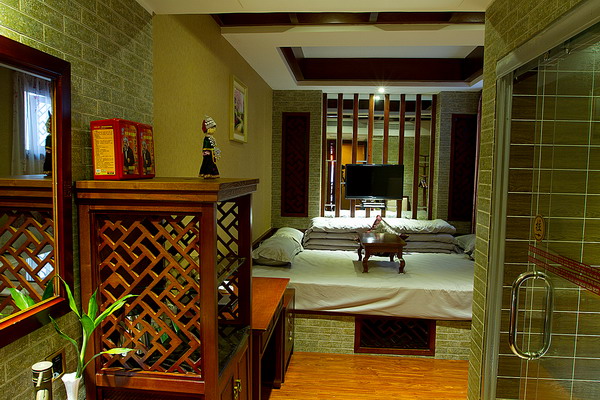客棧共設(shè)有商務(wù)套房、復(fù)式閣樓、北方炕房、土家新娘床、豪華雙標間、豪華大床房等不同格局房型共68間。
