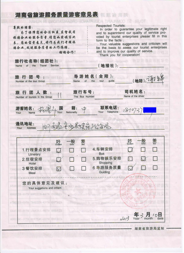 湖南楊先生一行11人旅游質(zhì)量回饋單