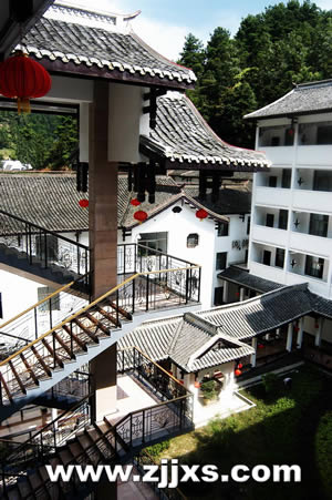 ·考慮到“不與山爭名,不與山爭高,不與山比美,不喧賓奪主,以建筑從屬環(huán)境,與環(huán)境之協(xié)調(diào)統(tǒng)一而突出山之自然景觀”這一宗旨,該實(shí)際運(yùn)用中國傳統(tǒng)式庭園層層院落深進(jìn)的布局,是一所多庭院的建筑群。它的門面小巧別致而院落深遠(yuǎn)寬闊,配有花圃水榭亭臺樓閣,頗具典型湘西土家“白墻、青瓦、紅柱、翹檐、吊腳”的民居風(fēng)格,與張家界森林公園景區(qū)的奇山座座、異峰排排、萬木蔥蔥的風(fēng)光景象和諧統(tǒng)一。它古色古香的韻味也與張家界風(fēng)景集“幽、野、神、奇、秀”為一體的特點(diǎn)所融匯。