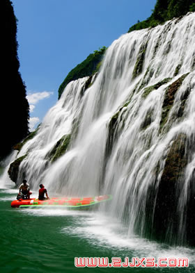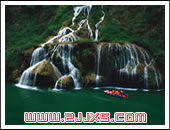 [水洞子瀑布]而鬼門關(guān)的急浪更帶著幾分野氣,它是整條漂流線中最大落差的一個,同時也是最富有刺激的一段,和游人游性的情緒高漲的時刻,在有驚無險的情況之下,載著滿船的浪花闖過去。闖過鬼門關(guān)我們就可以觀水洞子瀑布了,水洞子瀑布是地下水叢石壁上一個大溶洞中流出,高約70米,寬約45米,它妙在既不循岸而落,也非一瀉而注而是先順崖隙而出,時開時合,好似碎玉遍山,又如摧冰下滑。從懸崖上跌落下瀉,乘船近瀑布,又覺水從天降,那跌沖崖臺的如練垂瓊座,直落碧潭的似玉結(jié)帷簾,飄浮船中的若裙帶輕逸,水洞子瀑布既有高山流水之雅,又有飛瀉直落之雄,過水洞子瀑布到繞瀾灘頭,這繞瀾子的名字,是因為石岸的神蛙石到南巖一帶的懸崖,很像秦皇所建的長城吧。在長城的下面圍繞著一條瓊練的玉帶,故稱繞瀾,但繞瀾的浪濤也有著不同別的灘,灘下的淺潭,清澈迷人,峭壁屏立,引人嘆奇,經(jīng)陰陽潭、黃土角等大小五道灘,便來到阻舟河,兩岸青峰陳列,使人聯(lián)想到小三峽的景色,而且三峽之處,就是滿山的翠葉隨著季節(jié)的變遷,時而綠如菌,時而紅似火?坑野斗屙斢幸唤M造型別致的巖石,他們?nèi)绻P如柱,如猴如僧,很像是“西游記”中的唐三藏他們師徒四人正向西天出發(fā)呢! |