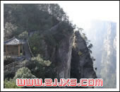 在“后花園”的對面,是一座巍峨的山巒,山上古木參天,遮天蔽日。森林中常有野山羊出沒,夜深人靜之際,常能聽到野羊羔“咩洋”地叫聲,因此被稱作“羊寨”。民國時期,此地曾為土匪占領(lǐng),直到現(xiàn)地,山上還殘留有卡門、暗堡、斷壕、屋場、水井、碓臼、磨坊等殘跡。粗大的松樹上還留有土匪當(dāng)年留下的“V”字型標(biāo)志。站在“山寨”上,舉目眺望,可看見金鞭溪全景,只見一條美麗的溪水從數(shù)百座石林中緩緩穿過,顯得是那樣的幽靜、和諧。從“后花園”向前步行約100米,便是袁家界又一處絕世奇觀——迷魂臺,走上迷魂臺,只見上百座山巒拔地而起,峰涌而至,它們姿態(tài)萬千、氣勢非凡;有的似“天狗望月”,有的像“海螺出水”;有的像“將軍列隊”,有的如“一柱擎天”。幾道山坳和屏障將這些山巒有序的分開,使這些石峰更顯得層次分明,井然有序,在萬道霞光的點綴下,顯得蔚為壯觀,不同凡響。這更像是一幅畫家筆下的水墨丹青,“迷魂臺”攬勝,真宛如仙境神游啊。