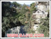 下車后小走幾步,便是上山游道,再沿著左邊的臺階下行50米,便可見一橢圓的石門,請大家屏住呼吸,不要出聲:請看在門前的左上角,有一石突出,像一只兇猛的動物,但此時卻特別安靜,你看它四肢伏地,抿嘴翹鼻,閉目養(yǎng)神,感覺中似乎伴有輕輕的“鼾”聲。大家沒有想到吧,它可就是鎮(zhèn)守后花園的雄獅?大家千萬別吵醒它。透過石門往里看,這里真是別有洞天啊,您看那生意盎然的“盆景”,那似是而非的“假山”;那櫛次枇鄰的“屏風(fēng)”、“壁畫”、“雕刻”;那形狀逼真的石桌、石椅;還有那川流不斷的“小橋流水”……這是誰的“大宅院”呢?不是,這是大自然的鬼斧神工造就了如此精美秀麗的“后花園”。進“后花園”往右走,在一石崖下有一條棧道,要貓著腰、低著頭,方能過去,站在中間向?qū)γ娲蠼幸宦暎骸拔覑勰恪,將會有?jīng)久不息的回聲從中傳出,愛——你——,愛——你——,愛——你……這種釋放會使您有一種從未有過的輕松和快感。