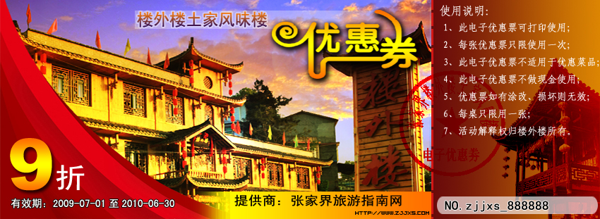 1、此電子優(yōu)惠劵(網(wǎng)絡(luò)版)由張家界樓外樓土家風(fēng)味樓聯(lián)合張家界旅游快車(chē)商務(wù)網(wǎng)聯(lián)合發(fā)行,真實(shí)有效; |