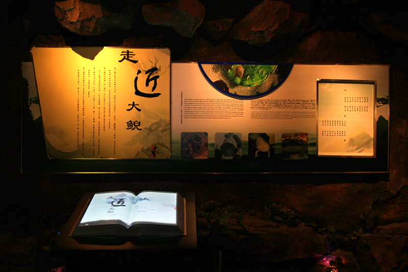 本展項是介紹大鯢各方面知識的圖文展板,展板前特別設(shè)置了一本《走近大鯢》的電子書,電子書深入介紹了大鯢的形態(tài)特征、生活習(xí)性等豐富的知識點。展墻對面是一個展示了大鯢標(biāo)本的展臺。本展項通過展板結(jié)合標(biāo)本的形式,以靜態(tài)結(jié)合互動的展示手段,讓游客全面獲悉大鯢的知識。