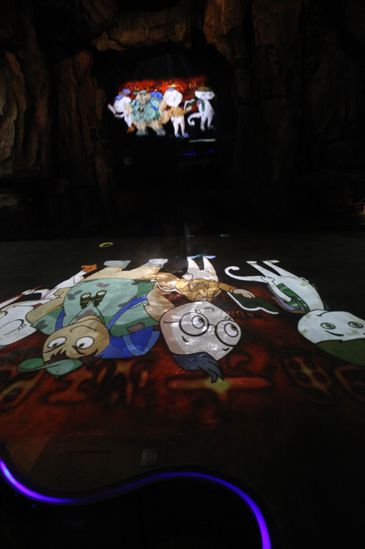 當(dāng)游客進(jìn)入到家園空間的最后階段的時候,家園四周的景象由秋天自然過渡到冬天,舉目一片白雪皚皚的景象;地面上投影效果也會變得白雪皚皚,游客在投影區(qū)域中走動會留下他們的腳印。