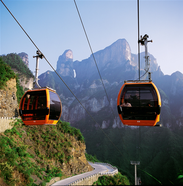 天門山索道線路斜長 7455 米 ,它以張家界市中心的城市花園為起點(diǎn),直達(dá)天門山頂?shù)脑伎罩谢▓@,猶如一道彩虹飛渡“人間” “ 天上 ” ,又象一條巨龍騰翔 素云蒼穹,依山籍壁,拔地沖天,恢宏壯觀。 天門山索道自 2003 年元月 15 日開工至 2004 年底竣工,總投資 2.26 億元人民幣。由于索道沿線山體高絕奇險(xiǎn),地質(zhì)地貌復(fù)雜多變,設(shè)計(jì)和施工難度遠(yuǎn)遠(yuǎn)超乎一般,整個(gè)建設(shè)過程艱辛無比。天門山索道不僅凝結(jié)了中外參建人員的智慧和汗水,也融合了當(dāng)代索道工程最先進(jìn)的科技成果,堪稱當(dāng)代索道工程建設(shè)中的一個(gè)奇跡,一個(gè)里程碑。 天門山索道綜合了世界上最尖端的客運(yùn)索道技術(shù),索道共有 57 個(gè)支架,其中含 3 個(gè)水平救護(hù)支架,支架由國內(nèi)生產(chǎn),主要設(shè)備均由法國波瑪公司供應(yīng),索道鋼繩來自于法國, 98 個(gè)吊廂來自瑞士 CWA 公司,單個(gè)造價(jià)高達(dá) 20 萬元人民幣。。索道的 運(yùn)載索 張緊系統(tǒng)采用液壓張緊方式,設(shè)一個(gè)中間驅(qū)動(dòng)站,是世界上最長的單線循環(huán)脫掛抱索器車廂式索道。轎廂體高 2 米 ,單個(gè)造價(jià)高達(dá) 20 萬元人民幣。索道鋼繩為 6 × 36WS 型,直徑 50.5 毫米 ,每米重達(dá) 10 公斤 ,索距 6.2 米 ,索道運(yùn)行速度為每秒 6 米 ,按順時(shí)針方向運(yùn)行,每兩個(gè)吊廂的間距為 172.8 米 ,時(shí)間間隔為 28.8 秒,單向運(yùn)量為每小時(shí) 1000 人,最大爬坡角 38.6 度,這在世界均屬罕見。 天門山索道最大的亮點(diǎn)就是它的爬坡面支架的設(shè)計(jì) ,這個(gè)支架共有壓索輪 96 個(gè),托索輪 16 個(gè),它綜合了現(xiàn)代物理學(xué)、現(xiàn)代工程學(xué)、現(xiàn)代制造業(yè)中最先進(jìn)的理論和成果,應(yīng)用了世界最先進(jìn)的索道技術(shù),從而使這段索道總給人一種蕩氣回腸、氣勢沖天的感覺。 同時(shí)為應(yīng)對臨時(shí)發(fā)生的特殊情況,天門山索道設(shè)計(jì)了 “ 水平救護(hù) ” 和 “ 垂直,用于索道突然處于全面癱瘓時(shí)將游客安全救護(hù)至地面,這是目前世界上索道中的一套最完備最先進(jìn)的救護(hù)系統(tǒng)。并為確保特殊天候下的安全,索道站房都安裝了防雷電設(shè)備。