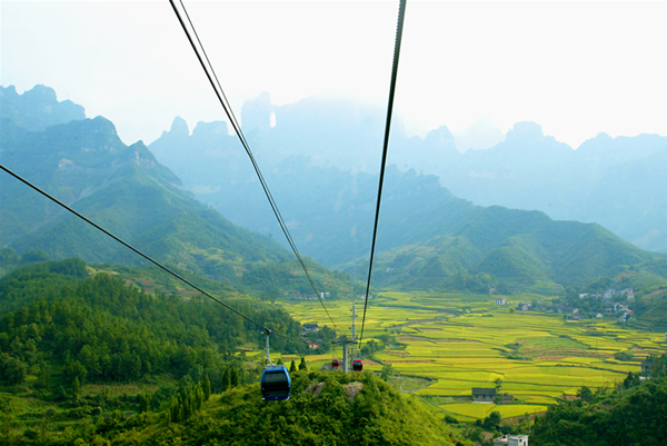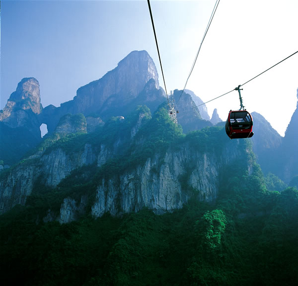 隨通天大道盤旋而上, 可以領(lǐng)略到天門山索道與藍(lán)天白云相映成趣的蔚蔚壯觀和奇絕高險(xiǎn),還能在經(jīng)過索道中站房時(shí)感受大自然的奇妙和飄然,那座頗似馱滿元寶的烏龜?shù)纳椒褰凶鼋瘕旕W元寶.再收回遠(yuǎn)眺的目光來看近前,有一道天然畫屏橫在面前,這就是天門畫屏了.仔細(xì)觀望認(rèn)真度量之后會覺得整座天門山就如一幅雄踞于天際的妙筆丹青.綠,是生機(jī)盎然的氣息;白,是流溢飛揚(yáng)的風(fēng)采;黑,是雄奇崔巍的俊朗;氤氳的,則是如竺如籟的仙韻.一任斗轉(zhuǎn)星移,風(fēng)云變幻,天門山始終以壁立萬傾的雄偉粗獷揮灑著“張家界之魂”的磅礴和雄渾.