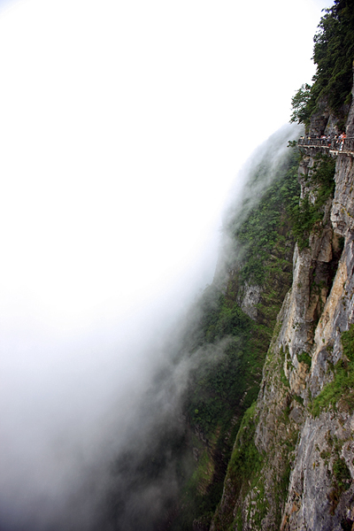 游覽通天大道,令人感受最深的也許就是一個(gè)“驚”字.驚“通天大道”蜿延峻巡于群山絕壁之上的絕險(xiǎn),驚“通天大道”艱苦建筑于壁立萬傾之中的奇?zhèn)?驚“通天大道”玉帶飄揚(yáng)于寰宇蒼穹之間的人類創(chuàng)造史的奇跡.