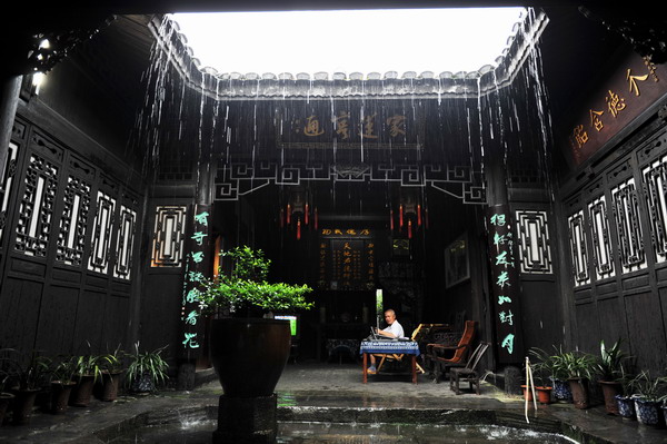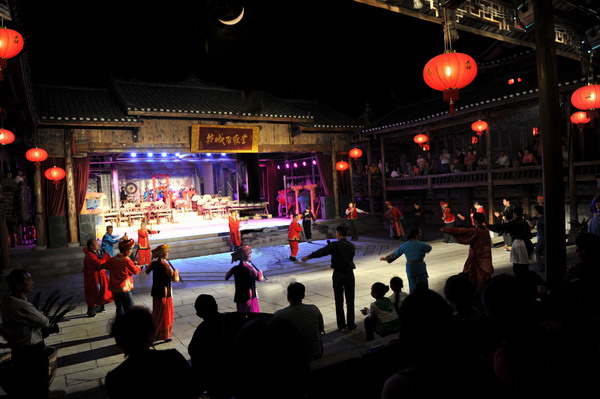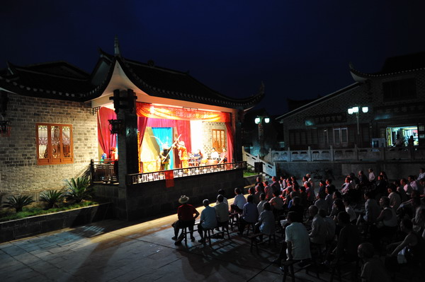 沒走幾步,一支帶著童音的歌聲,從一座木板庭院里傳出,幽雅,張揚(yáng),我們循聲走進(jìn)這棟老屋,庭院里居然是一處表演場,一個(gè)小姑娘握著話筒在舞臺(tái)上一邊歌唱,一邊表演。這邊觀眾臺(tái)前端莊地坐著幾位帶有藝術(shù)氣質(zhì)的中年人,他們在細(xì)語,像是在評判著那個(gè)姑娘的姿態(tài)和演唱。